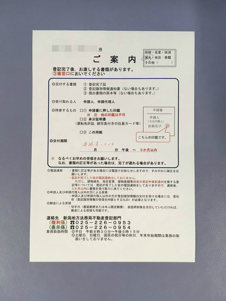 建物滅失登記は、登記官の方が現地を確認した後に登記完了証が発行されるので、手続きが完了したら電話をしますので3箇月以内に受け取りに来てください、とのことでした。