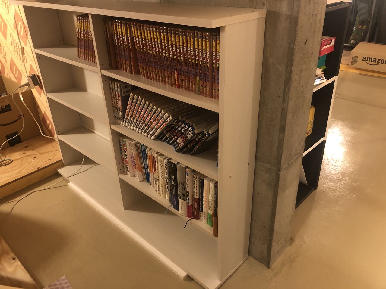 増えてきたマンガ類も、居室から片付けやすいように床下へ降りる階段から一番近い場所に本棚を設置しました。