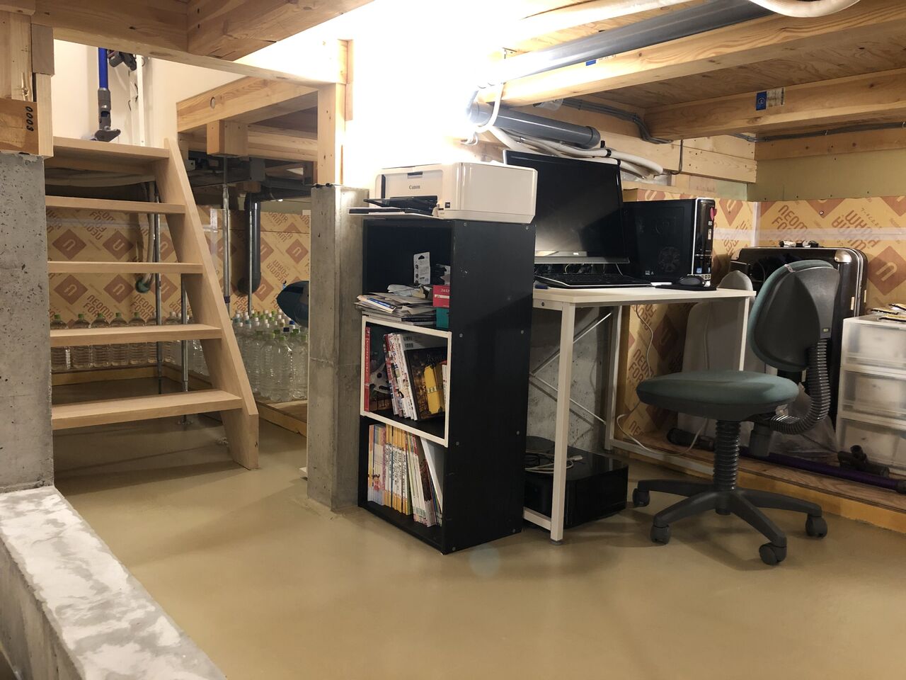 まだ片付いていませんが、ひとまずテレワークで使用できる状態になりましたので、高基礎の床下空間はこんな使い方もできますよ、ということでご紹介します。